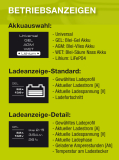 Fünf optimierte Ladeprofile stehen zur Auswahl - drei für die Bleitypen Gel-, Vlies- [AGM], und Nass- [WET] Akkus sowie eines für LiFePO4 [Lithium] Akkus.