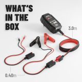 1x Ladegerät mit Krokodilklemmen und zusätzlichem Adapterkabel zur Festinstallation an der zu ladenden Batterie